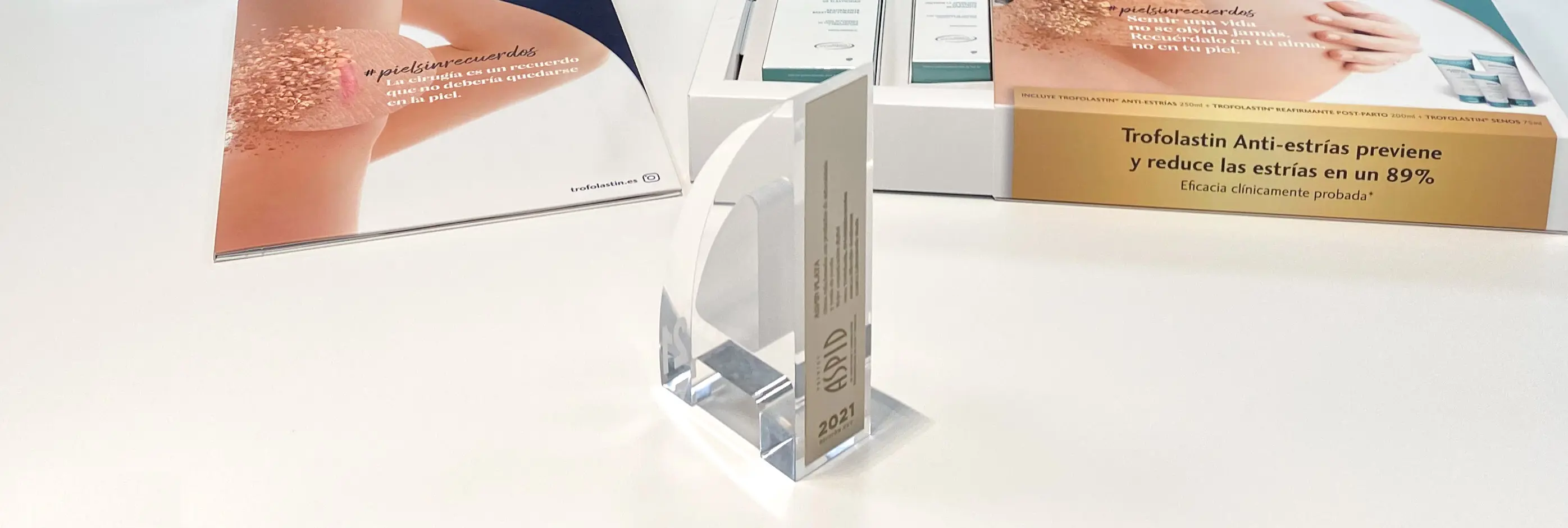 Sant Just Desvern, 18 de junio de 2021 – Trofolastín, marca referente para el cuidado de las estrías y cicatrices, ha sido galardonada como una de las mejores iniciativas del año en la presente edición de los Premios Aspid de comunicación y publicidad iberoamericana de salud y farmacia. Este certamen anual, convocado por la revista PMFarma, reconoce las mejores iniciativas de comunicación y publicidad relacionadas con el mundo de la salud.La campaña “Piel sin recuerdos”, galardonada con un Aspid de Plata, se integra en el relanzamiento de la marca Trofolastín y ha sido desarrollada por la agencia Microbio Gentleman con el objetivo de fortalecer la conexión con los distintos grupos de interés de la firma. Por ello, se ha diseñado un ambicioso plan de comunicación digital dirigido a las distintas audiencias y en una identidad visual que muestra el efecto del producto en la piel. Con este concepto visual, se ha presentado una nueva imagen de la marca dirigida a sus distintos momentos de consumo: embarazo, deporte, pérdida de peso, cambios hormonales, lesiones.