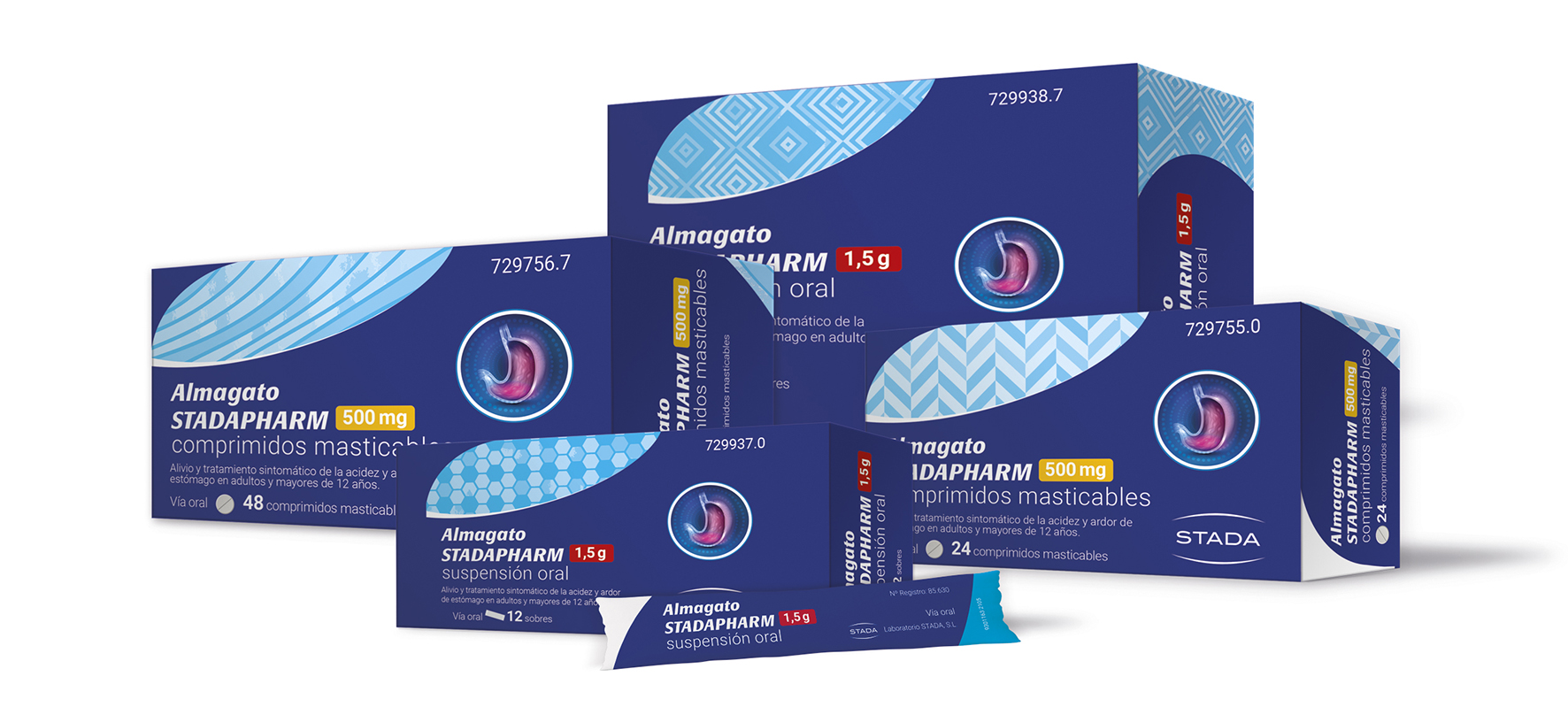Almagato STADAPHARM1 es un medicamento sin receta indicado para el alivio de los síntomas de la acidez y ardor de estómago. Gracias a su rápida acción, actúa contra la acidez en menos de un minuto, neutralizando el ácido del estómago e inhibiendo la pepsina. Está disponible en dos cómodos formatos con agradable sabor a menta, Almagato STADAPHARM 1,5 g suspensión oral en presentaciones de 12 o 24 “sticks” de fácil apertura, y Almagato STADAPHARM 500 mg comprimidos masticables en presentaciones de 24 y 48 comprimidos.