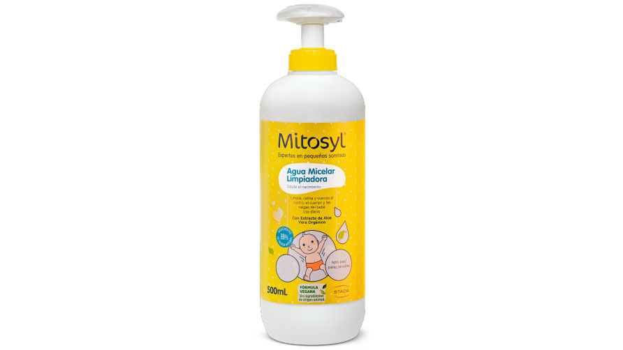 - La fórmula natural de Mitosyl Agua Micelar limpiadora, a base de camomila y aloe vera orgánico, limpia, calma y suaviza la piel del bebé en el cambio del pañal.