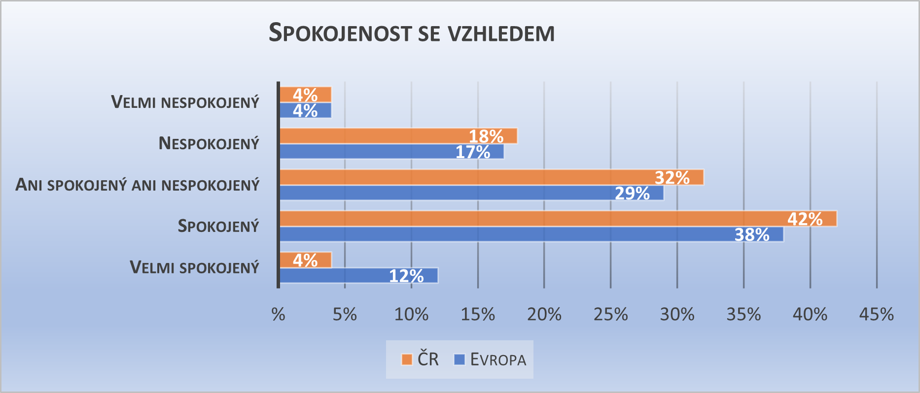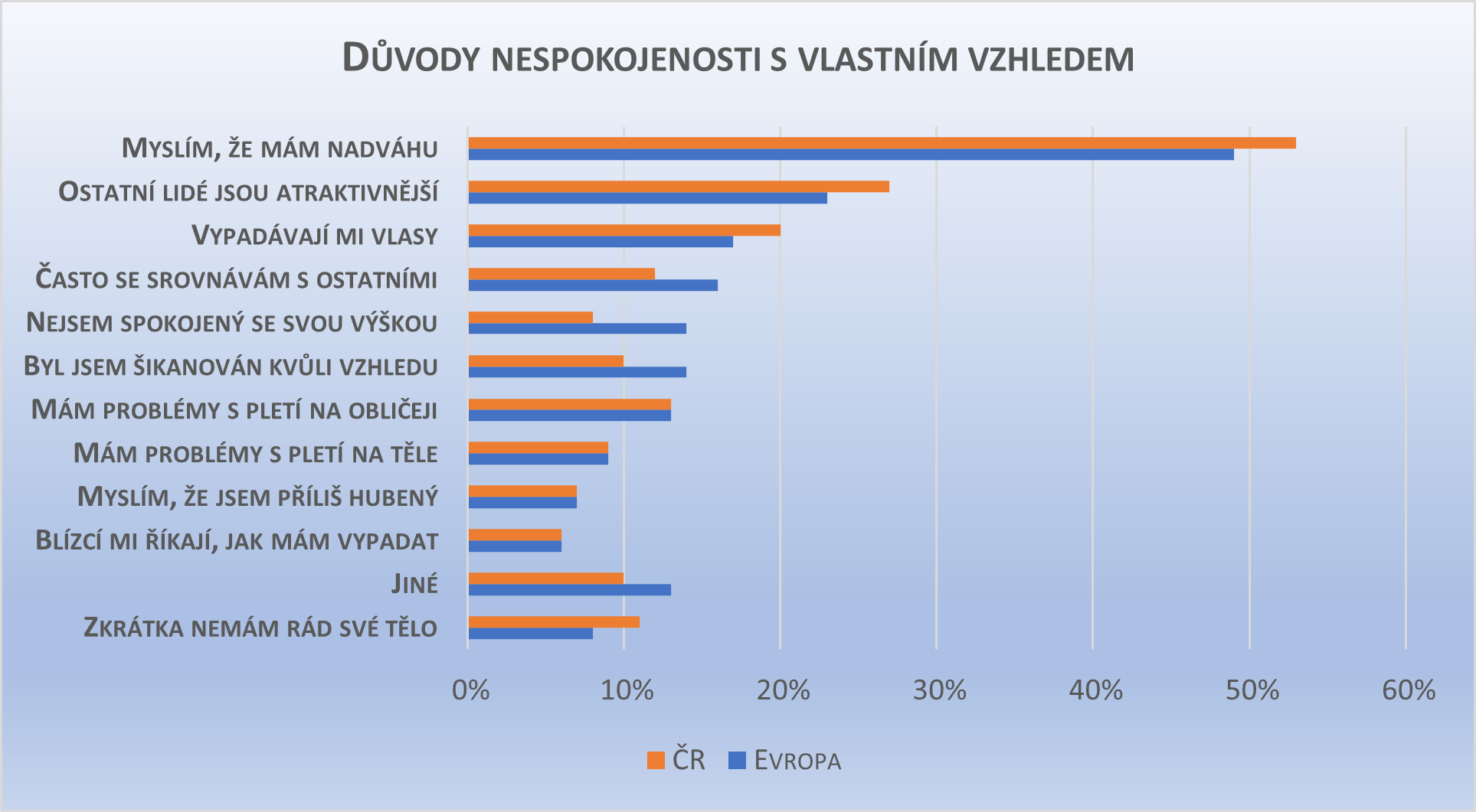 I přesto, že se více než polovina Evropanů (54 %, ČR 41 %) cítí být v dobrém fyzickém stavu, podobné množství dotazovaných se domnívá, že má nadváhu (49 %, ČR 53 %). To je také nejčastější důvod nespokojenosti s vlastním vzhledem. Hodnotu ukazatele BMI, jež je sice lehce kontroverzní, nicméně se stále běžně používá jako nástroj pro hodnocení procenta tělesného tuku, má v normě pouze 40 % dotazovaných (34 % Čechů). O něco více než třetina Evropanů (35 %, ČR stejně) by byla podle BMI považována za osoby s nadváhou a dalších 17 % (ČR 23 %) spadá do kategorie „obézních“ s BMI 31 a více.