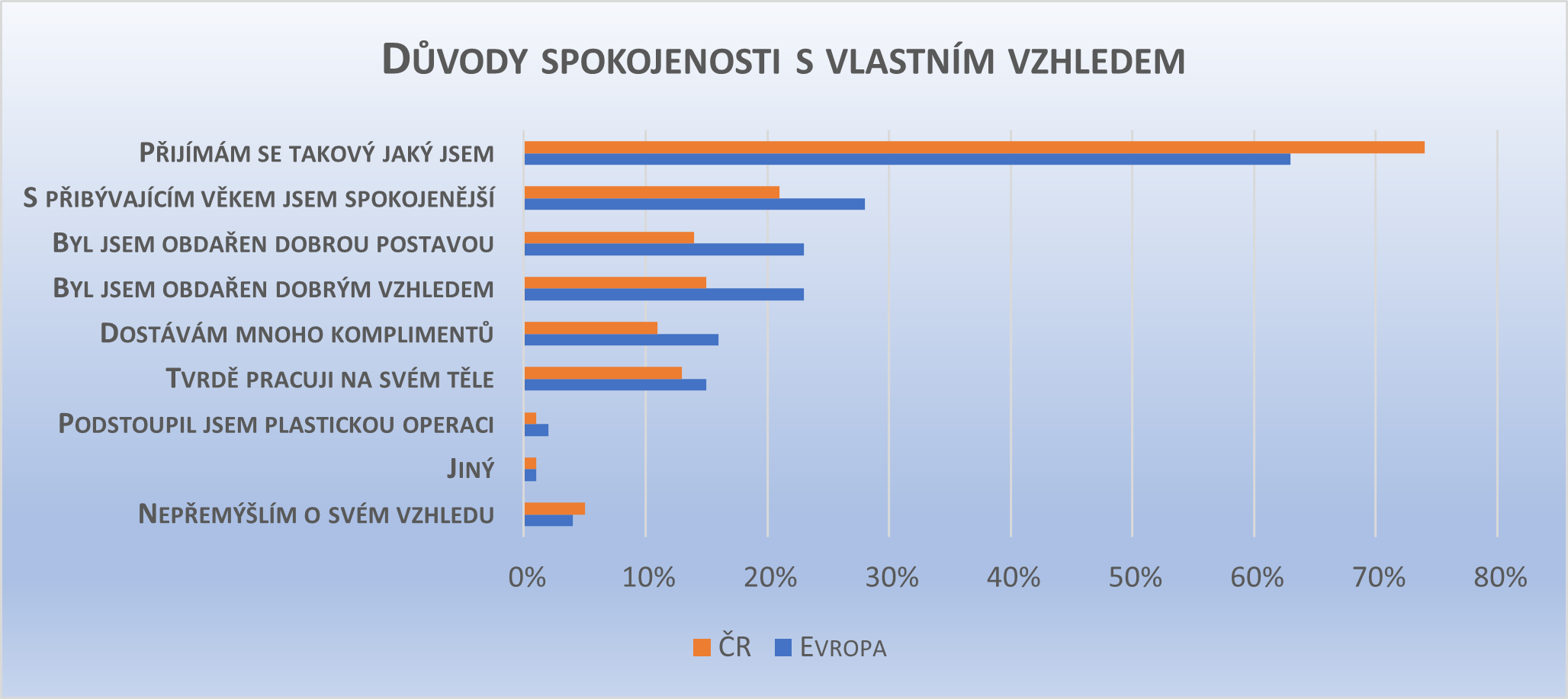 Většina lidí, kteří se cítí se svým vzhledem dobře, říká, že se přijímají takoví, jací jsou (63 %, ČR 74 %). Ostatní mají pocit, že byli obdařeni dobrým vzhledem (23 %, ČR 15 %) nebo dobrou postavou (23 %, ČR 14 %). 16 % respondentů (ČR 11 %) uvádí, že jim k dobrému pocitu pomáhá vnější potvrzení v podobě komplimentů, a 15 % (ČR 13 %) tvrdí, že na svém těle tvrdě pracují. Důležitou roli v tomto ohledu hraje také věk, protože více než čtvrtina Evropanů (28 %, ČR 21 %) uvádí, že spokojenost s jejich fyzickým vzhledem se zvyšuje s věkem.