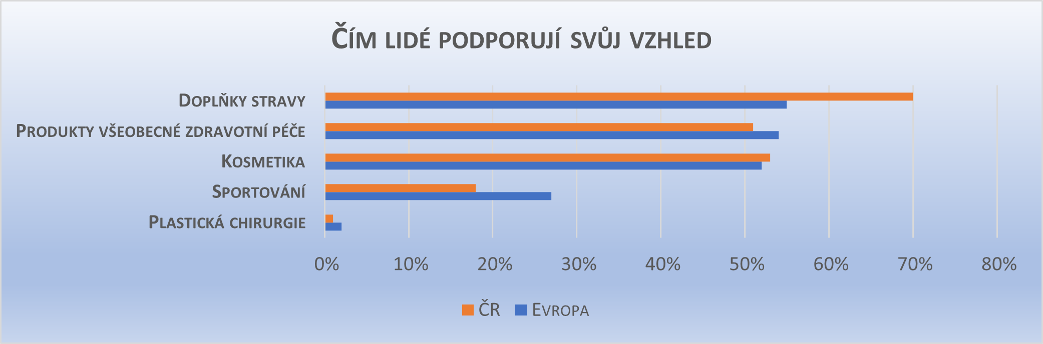 Jak řeší Evropané nespokojenost se svým fyzickým vzhledem a související pocity nejistoty? Prvenství mají vitaminy a minerály, za které 37 % (ČR 50 %), resp. 18 % Evropanů (20 % Čechů) utrácí „určitou“ nebo „značnou“ částku peněz. Druhým nejčastěji zmiňovaným výdajem jsou přípravky pro všeobecnou zdravotní péči, které si kvůli zlepšení svého vzhledu pořizuje 54 % respondentů (ČR 53 %). Kosmetické výrobky, jako jsou make-up, hydratační krémy a podobně, kupuje celkem 52 % Evropanů (ČR 51 %), z toho 72 % žen (ČR 71 %).