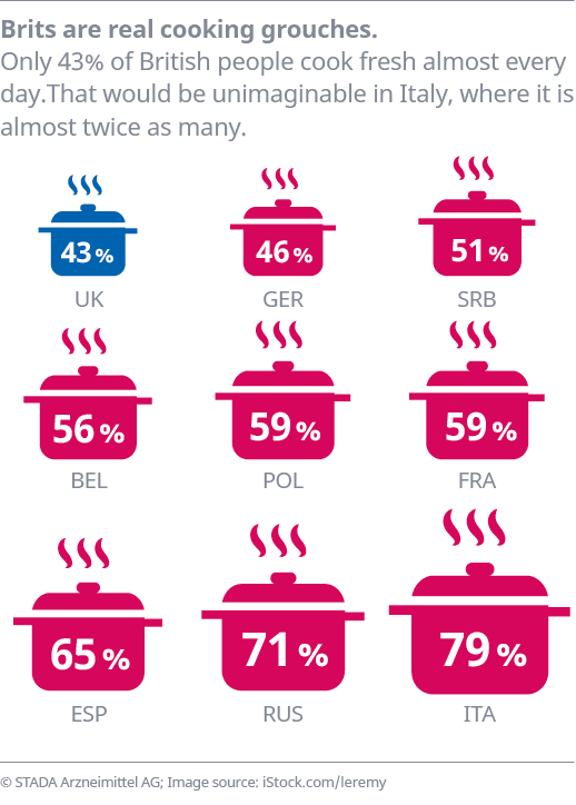 Bad Vilbel, July 10, 2019 – Only 46 percent of Germans prepare fresh meals almost every day. In a Europe-wide comparison, only the Brits rattle pots and pans less often. However, people in other countries put much greater emphasis on homemade food. Nutrition is one of the hot future topics when it comes to health. Additionally, a healthy diet is considered an integral part of a healthy lifestyle. The representative STADA Health Report 2019 shows that there are significant differences between Europeans in this regard. 18,000 people in nine European countries were interviewed for the study.