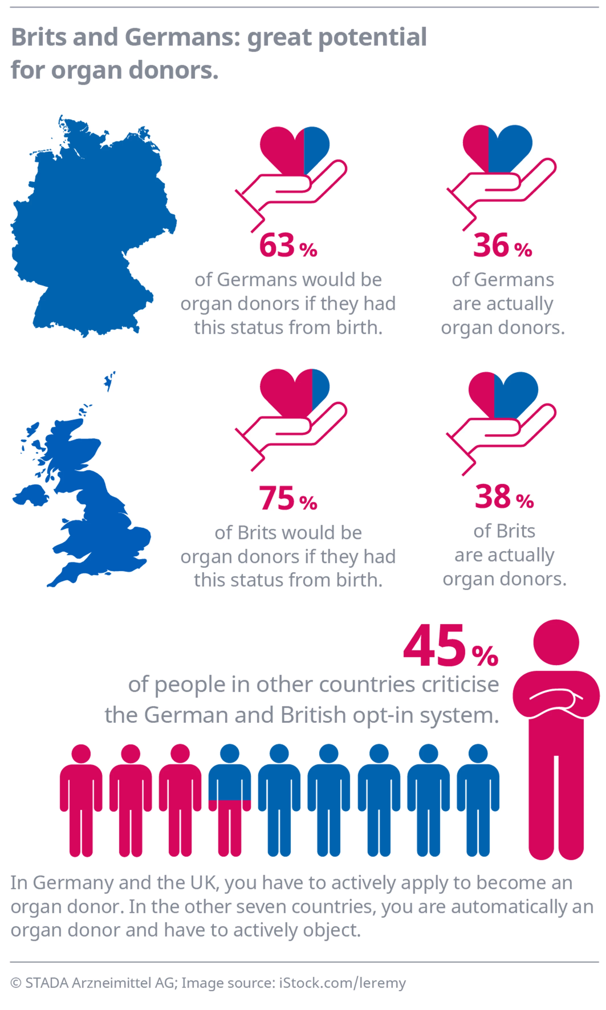 - 63 percent of Germans and 75 percent of Britons would be organ donors if they were automatically signed up from birth – de facto only 36 percent of Germans and 38 percent of Britons have a donor card today.