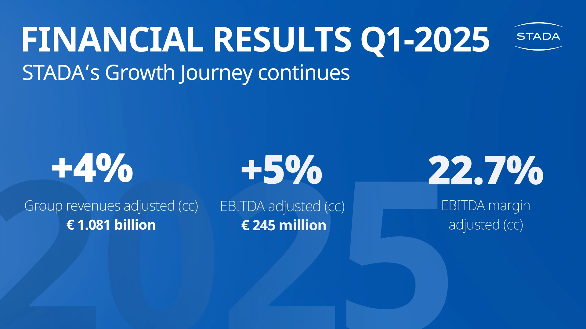 - STADA CEO Peter Goldschmidt: ”Our resilient three-segment business model delivered again in the first quarter of this year. The diversified portfolio and broad footprint enabled us to overcome geopolitical challenges and market uncertainty. With limited exposure to the US market, to tariff reforms and to currency fluctuations, I am very confident that we will continue our strong growth journey also in 2025.”