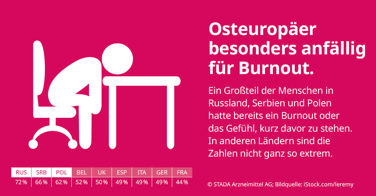 - 49 Prozent der Deutschen hatten selbst schon einen Burn-out, das Gefühl kurz davor zu stehen oder kennen die Symptome aus eigener Erfahrung. Noch extremer sind die Zahlen in Polen (62 Prozent), Serbien (66 Prozent) und Russland (72 Prozent).