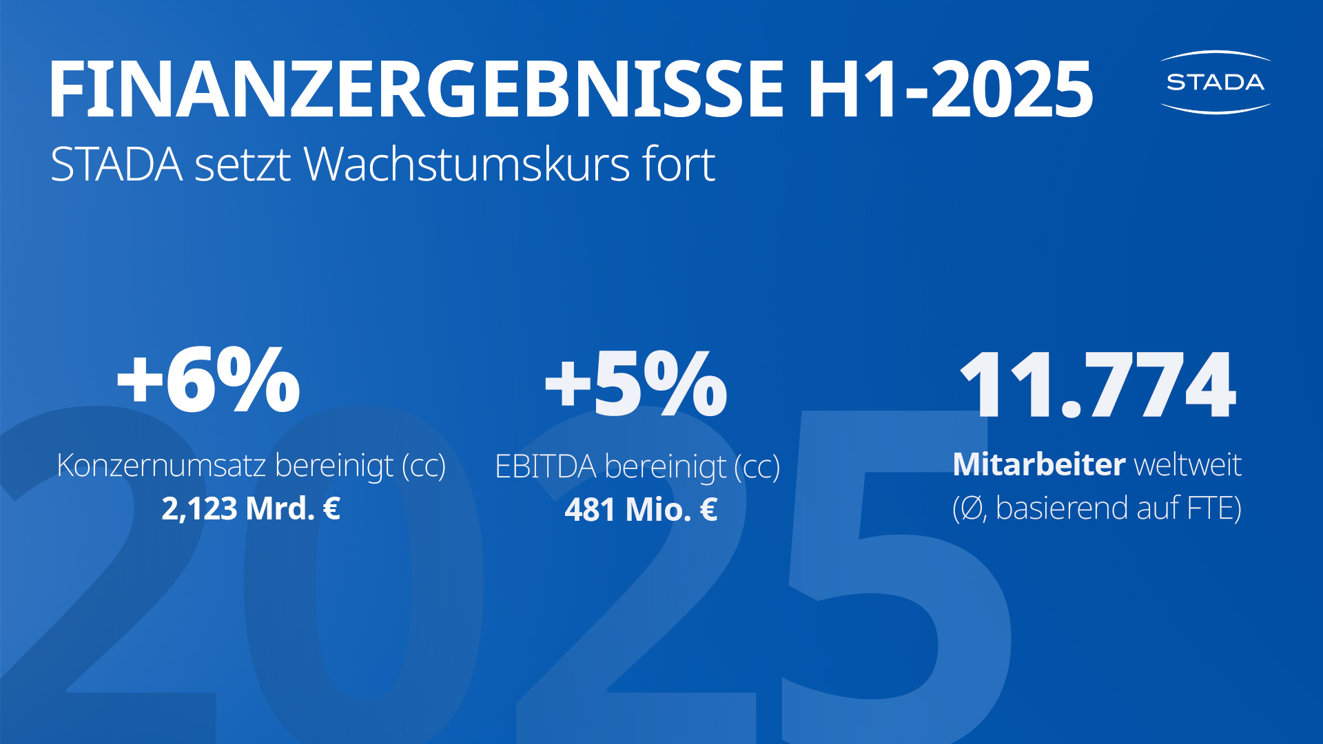 Bad Vilbel, Deutschland - 28. August 2025 - STADA, ein führender Gesundheits- und Pharmakonzern in den Bereichen Consumer Healthcare, Generika und Spezialpharmazeutika, hat im ersten Halbjahr 2025 ein starkes Wachstum bei Umsatz und Ergebnis erzielt. Der bereinigte Konzernumsatz stieg auf Basis konstanter Wechselkurse gegenüber H1 2024 rein organisch um 6 % auf 2,123 Mrd. Euro. Das Segment Spezialpharmazeutika erzielte einen prozentual zweistelligen Umsatzzuwachs und trug damit maßgeblich zu der positiven Entwicklung bei.