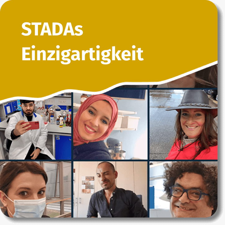 STADA betrachtet Diversität als Einzigartigkeit. Schließlich sind es die rund 12.500 Mitarbeiter weltweit, die mit ihren unterschiedlichen Persönlichkeiten, Hintergründen und Fachkenntnissen ein herausragendes Team bilden. Es richtet sein Handeln stets an den vier Unternehmenswerten aus und gibt täglich sein Bestes, um ein gemeinsames Ziel zu erreichen: Caring for People’s Health as a Trusted Partner.