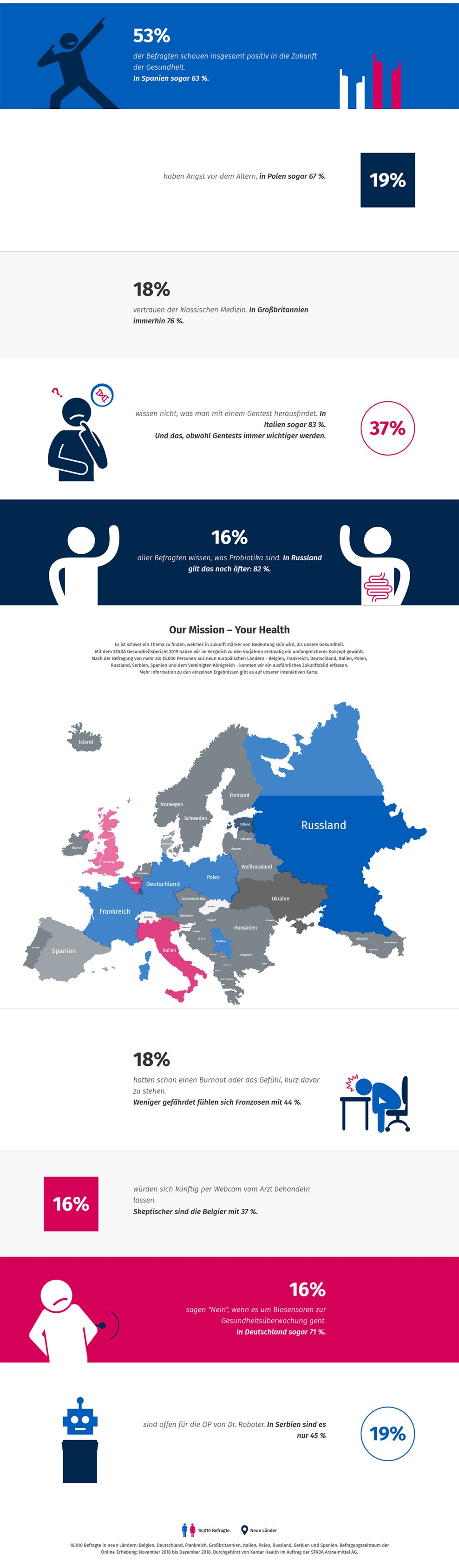 Wie sieht die Zukunft der Gesundheit aus? Vielschichtig, so viel ist klar. Es geht um Hightech-Medizin, aber auch um Sorgen, Einstellungen und Verhaltensweisen. Wir machen uns auf den Weg in die Zukunft: Von der Angst vorm Altern, über zunehmende Burnout-Fälle bis hin zur Operation von Dr. Roboter.