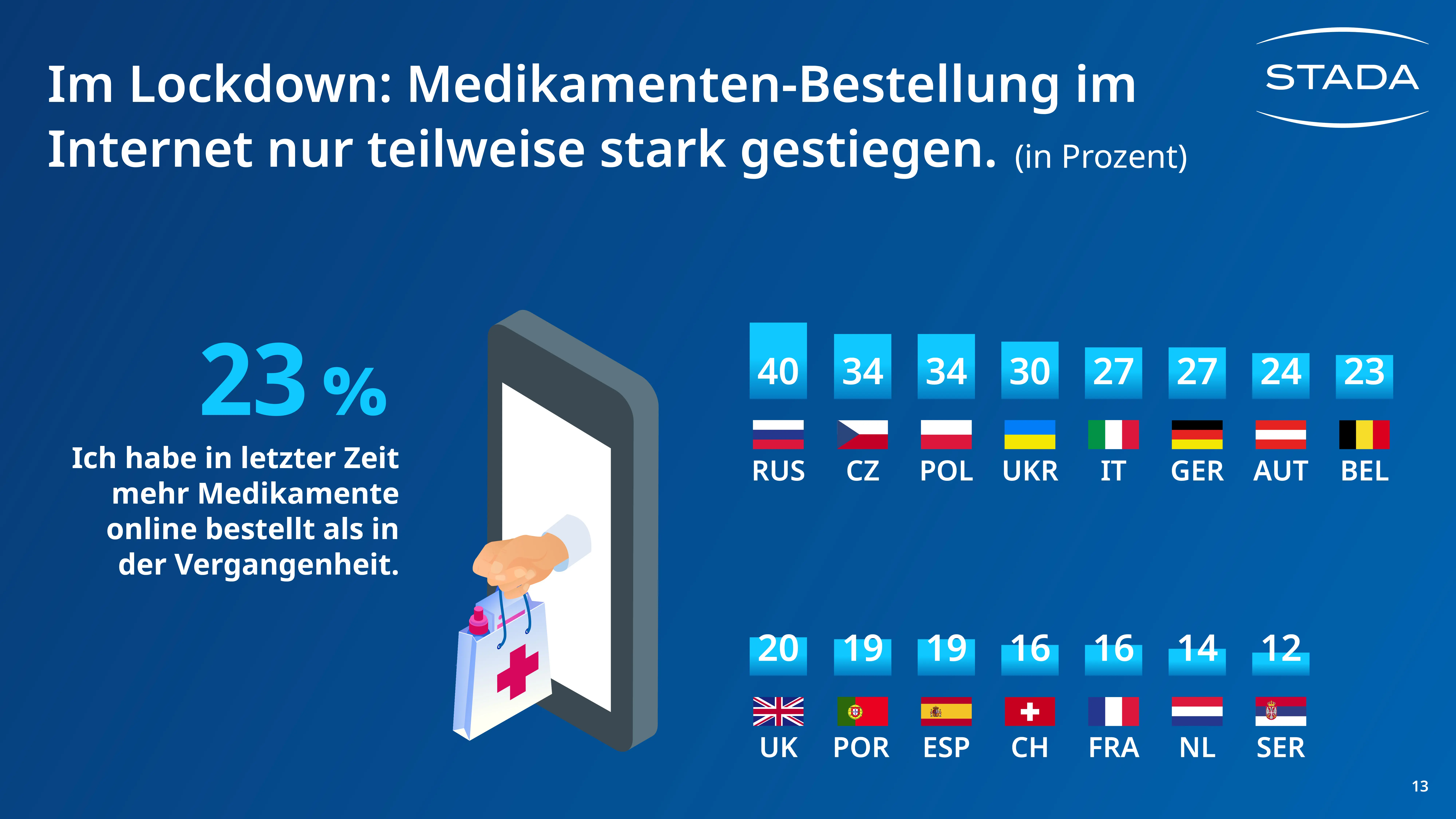 In Kooperation mit dem Marktforschungsunternehmen Kantar haben wir die Onlineumfrage von Mitte März bis Mitte April 2021 durchgeführt. Pro Land wurden rund 2.000 Personen im Alter zwischen 18 und 99 Jahren befragt – wie immer repräsentativ für die Merkmale Geschlecht, Region und Alter. Der vorherige Health Report, der im Juni 2020 veröffentlicht wurde, basierte auf den Ergebnissen einer Onlineumfrage, die von Februar bis März 2020 durchgeführt wurde, also noch vor dem Ausbruch von Corona in Europa. Etwas später, im April 2020, wurde in fünf teilnehmenden Ländern eine Sonderumfrage durchgeführt, die die Datengrundlage für ein spezielles Corona-Kapitel im Health Report 2020 lieferte. Erfahren Sie mehr über das Studiendesign und die Methodik des STADA Health Report 2021: