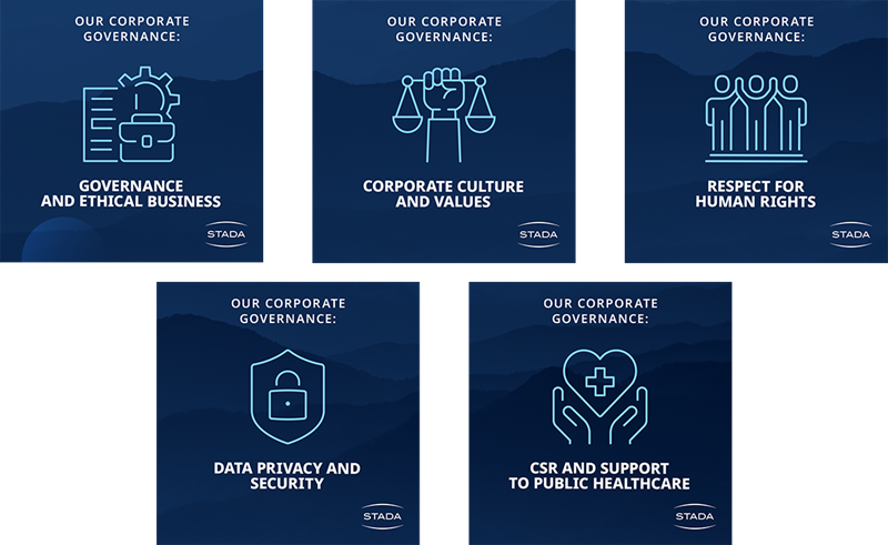 Diese Grundsätze werden durch unser Bekenntnis zu den UN GC 10-Prinzipien und ein ganzheitliches Engagement für alle greifbaren ESG-Aspekte stark unterstützt. Dieses Engagement zielt darauf ab, die positiven Auswirkungen der Geschäftstätigkeit von STADA und des Verhaltens der Mitarbeiter zu verstärken.