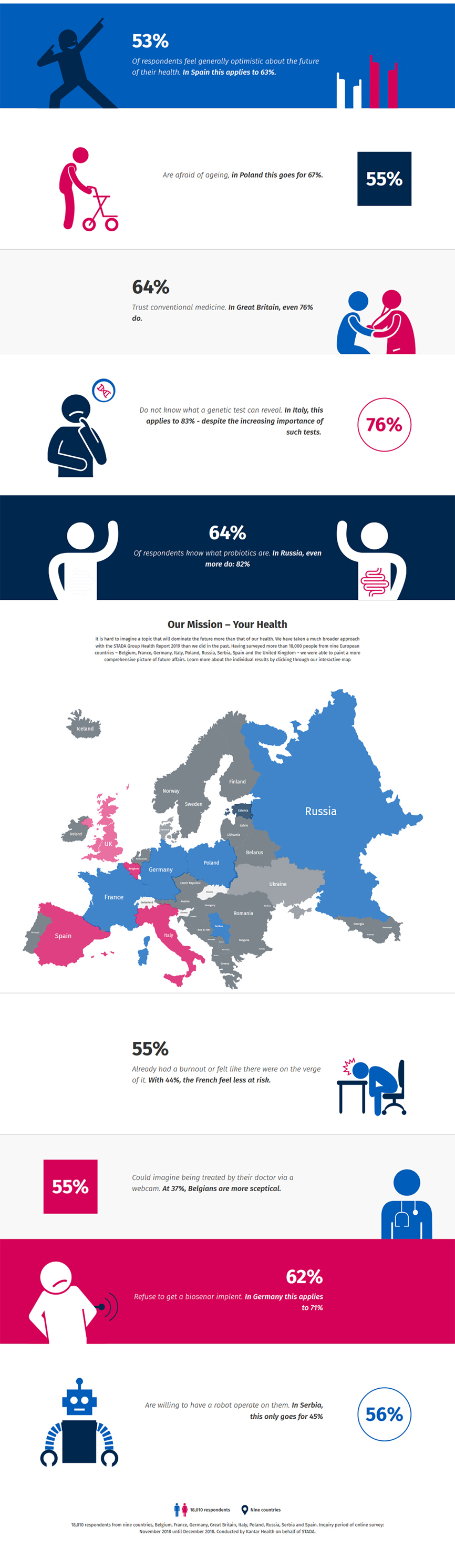 56 percent of Europeans would undergo surgery with “Dr Robot” and 54 percent would receive treatment from their GP via webcam. These are two key findings of the STADA Health Report 2019. The study stands under the sign of the Future of Health and includes 18,000 respondents from nine European countries. The report also shows that 4 out of 5 Europeans would take a gene test and 38 percent would be willing to get a biosensor implant. Looking at the results in detail, interesting disparities come to light between the individual countries. Who is ready for the future of health?