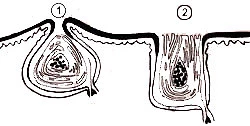 Durch eine übermäßige Talgproduktion und eine Verhornungsstörung, verstopfen bei Akne die Talgdrüsenöffnungen und es entstehen die so genannten Mitesser (Komedonen). Diese können sich durch Bakterien entzünden oder sogar eitern; es bilden sich Pickel. Man unterscheidet zwischen offenen Mitessern (schwarzes Köpfchen), geschlossenen Mitessern (weißliche Knötchen) und Aknepusteln oder -pickeln (entzündete Mitesser). Außerdem kann man zwischen der leichten oberflächlichen Akne und der schwereren tiefen Akne mit tief unter der Haut liegenden entzündeten Knoten unterscheiden. Die tiefe Akne führt oft zu Narbenbildung, während die oberflächliche Akne nur durch falsche Behandlung ("Herumdrücken") zu Narben führt.