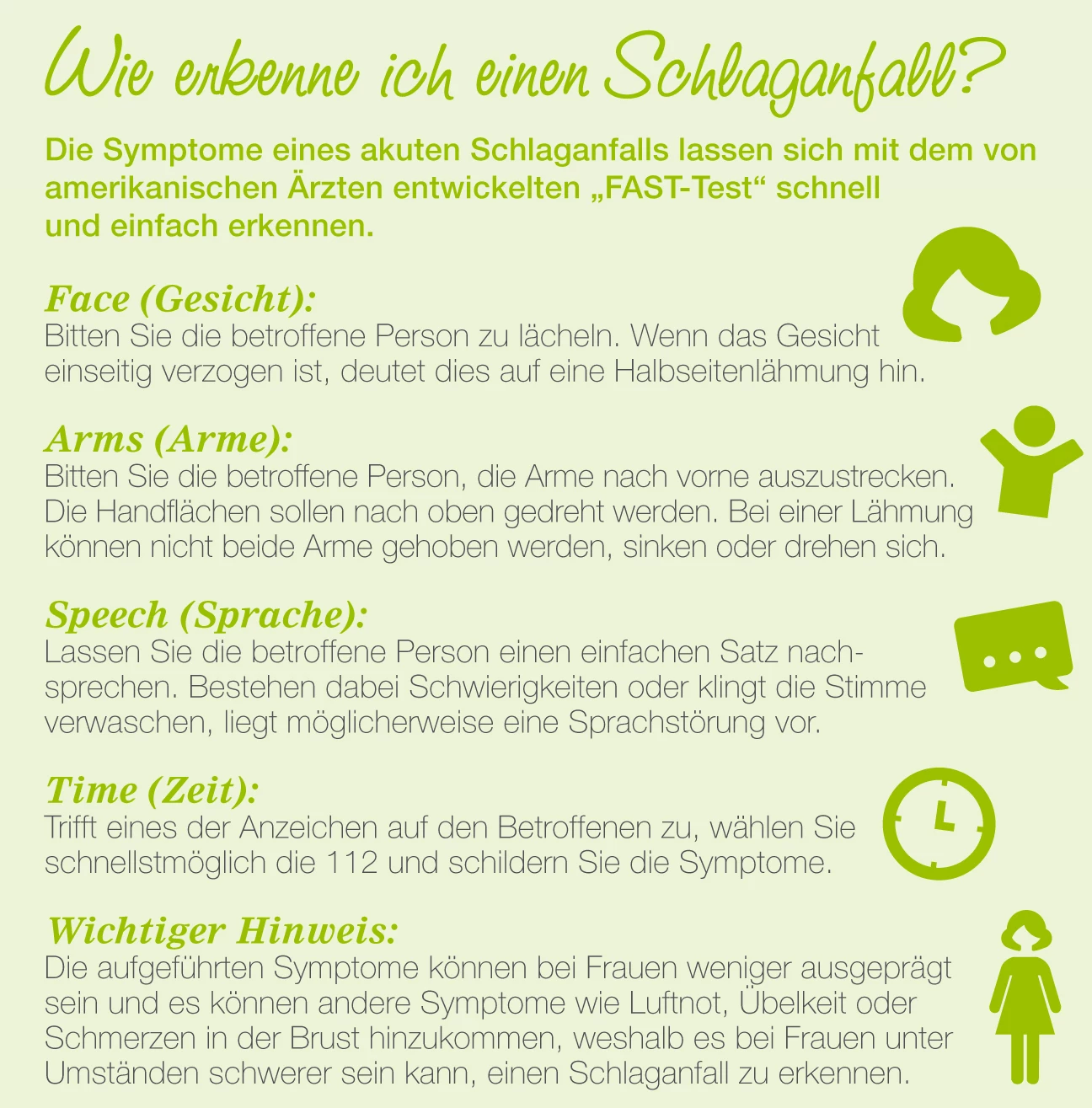 Damit Sie wissen, wie Sie einen akuten Schlaganfall schnellstmöglich erkennen können, haben amerikanische Ärzte den soganennten FAST-Test entwickelt. Die Buchstaben F–A–S–T stehen für Face (Gesicht), Arms (Arme), Speech (Sprache) und Time (Zeit).