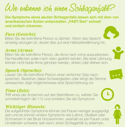 Wichtiger Hinweis: Die aufgeführten Symptome können bei Frauen weniger ausgeprägt sein und es können andere Symptome wie Luftnot, Übelkeit oder Schmerzen in der Brust hinzukommen, weshalb es bei Frauen unter Umständen schwerer sein kann, einen Schlaganfall zu erkennen.