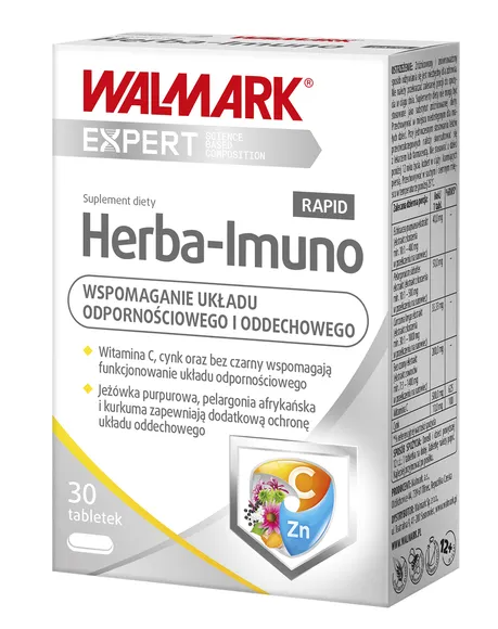 Herba-Imuno Rapid to wieloskładnikowy suplement diety zawierający wysoką zawartość witaminy C i cynku dla wsparcia układu odpornościowego. Szczególnie polecany w okresie jesienno-zimowym, kiedy organizm narażony jest na szkodliwe działanie czynników zewnętrznych. Preparat został wzbogacony specjalnie dobraną kombinacją ekstraktów ziołowych stosowanych tradycyjnie do wspomagania układu oddechowego.