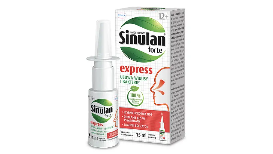 Sinulan Express Forte, wyrób medyczny w postaci aerozolu do nosa wykazuje właściwości osmotyczne, które przyczyniają się efektywnego wypłukiwania zanieczyszczeń występujących w jamie nosowej. Dzięki temu preparat odblokowuje i udrażnia przewody nosowe. Eliminuje wydzielinę hamującą zatoki, co równocześnie otwiera je, ogranicza ciśnienie i dolegliwości bólowe. Tworzy powłokę, która zabezpiecza powierzchnię nosa przed przesuszeniem, podrażnieniem oraz innymi skutkami oddziaływania czynników środowiskowych. W skład preparatu wchodzą również olejki eteryczne, które przyczyniają się do wyraźnego ograniczenia stanów obrzękowych nosa i ułatwiają oddychanie.