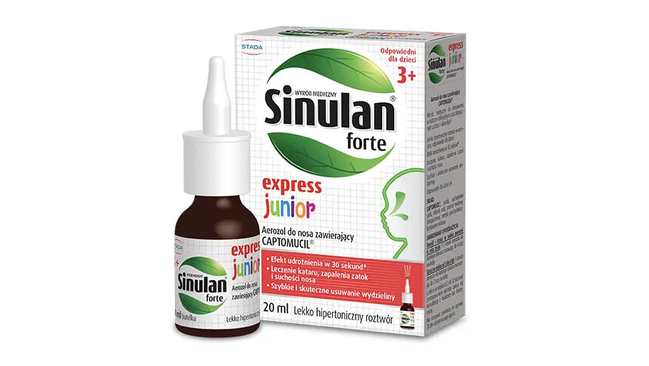 Sinulan Express Forte Junior wyrób medyczny w postaci aerozol do nosa zawiera opatentowany CAPTOMUCIL®. Jako roztwór izotoniczny, stosowany jest wspomagająco w stanach zapalnych, takich jak zapalenie błony śluzowej nosa, zapalenie zatok oraz w przypadku kataru lub suchości nosa. Szybko i skutecznie usuwa wydzielinę, udrożniając nos.