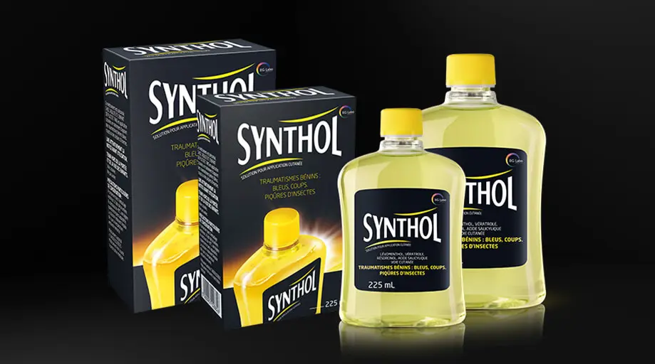 Médicaments indiqués en traitement local d'appoint des traumatismes bénins ou des piqûres d'insectes (uniquement pour Synthol, solution pour application cutanée), contenant du Lévomenthol, Vératrole, Acide salicylique et Résorcinol. Contiennent de l'alcool. Ne pas utiliser avant l'âge de 7 ans. Si les symptômes persistent plus de 5 jours, consultez votre médecin. Lire attentivement la notice. Demandez conseil à votre pharmacien. EG Labo Laboratoires EuroGenerics.