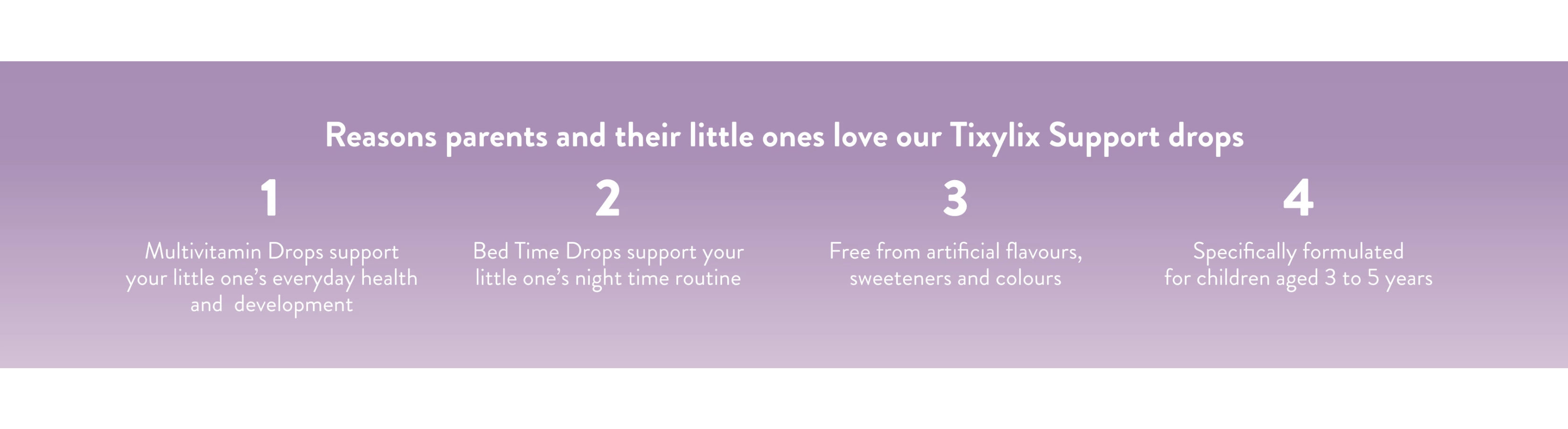Tixylix Multi-Vitamin and Bed Time Drops have been carefully formulated to support with children’s health, development, and sleep routines. Tixylix drops can be added to a drink (juice, water) or food to Infants and children aged 3 months to 5 years old.