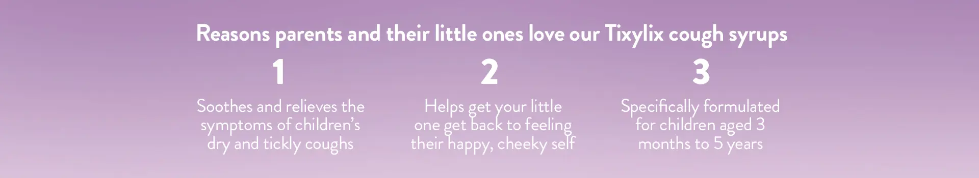 So how can our Tixylix syrups help with your little one’s cough? Our glycerol-based Tixylix syrups provide sugar-free coating for your child’s throat, helping to relieve the symptoms of a dry or tickly cough.