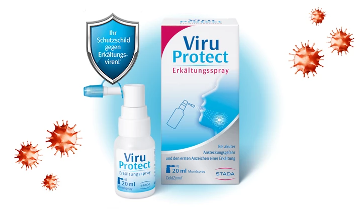 ViruProtect ist ein Mundspray basierend auf den sich ergänzenden Inhaltsstoffen Glycerin und dem natürlichen Enzym Trypsin, die sich wie ein Schutzschild über die Schleimhäute legen und eine Vielzahl an Erkältungsviren deaktivieren.2